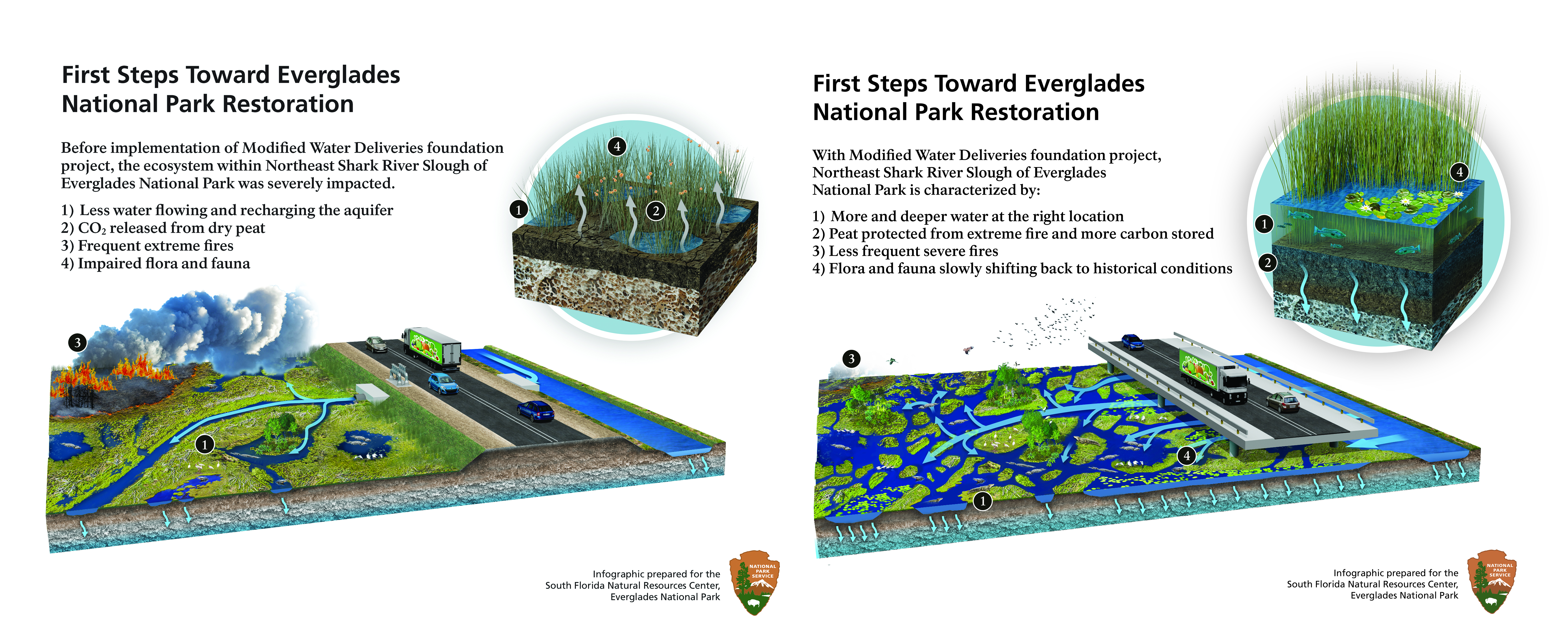 Infographic and 3D-Illustrations showing the steps toward Everglades National Park restoration and the desired outcome.